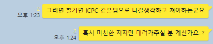 그런데 마침 최근에 들어간 jwpassion1님의 카카오톡 오픈채팅방 '경희대학교 PS 모임'에서, ICPC 팀원 구하는 채팅을 허용한다고 하셨다.