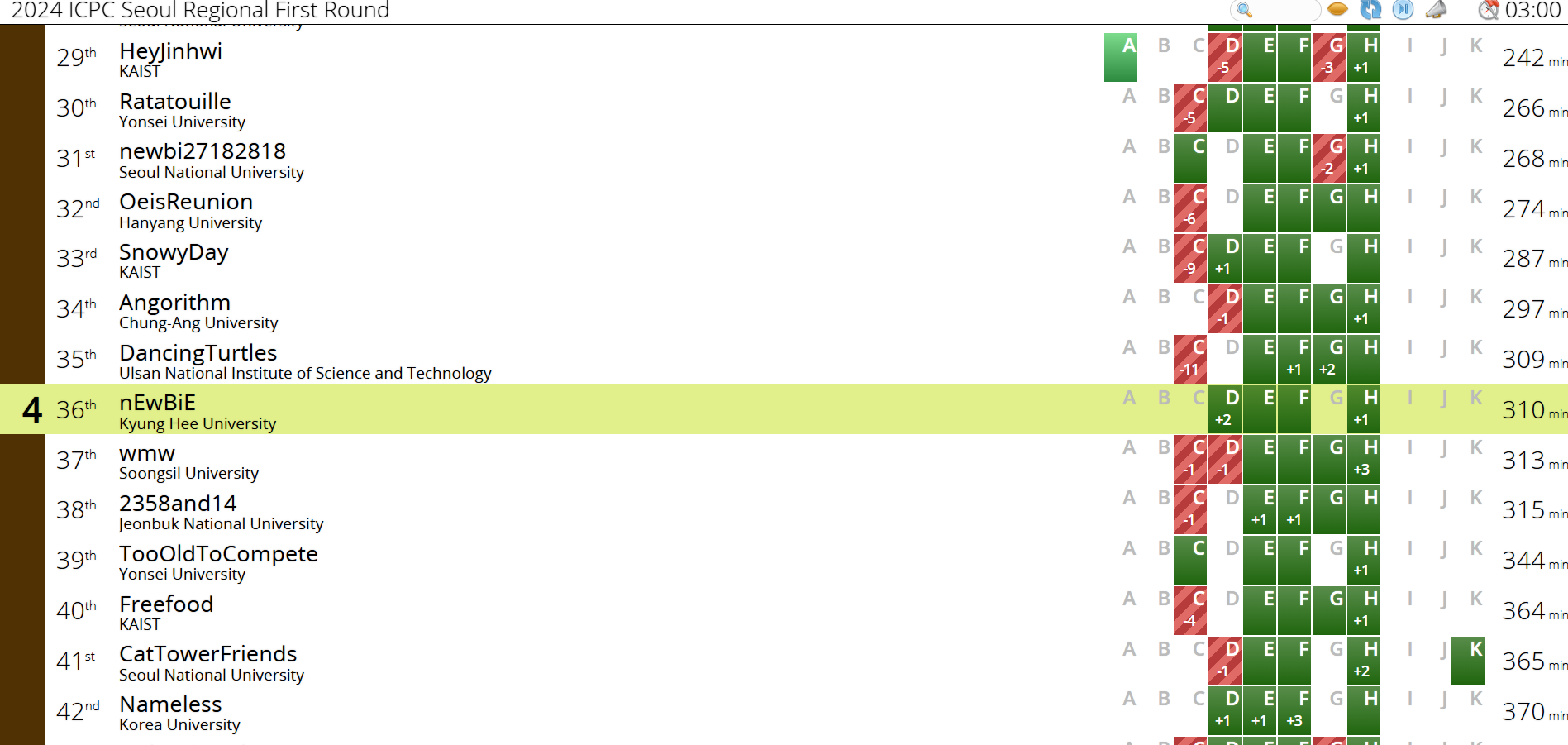 내가 E 구현하는 동안 F, H 풀이가 안 나왔다. 여기에서부터 이미 대회 망했다고 생각했다. 보통 ICPC 예선은 '5솔플마단'이라는 말이 있을 정도로 한국어 문제는 빠르게 풀고 이후 2-3문제가 본선 진출을 가르는데, 한국어 문제가 쉬운 게 E 말고 없었다는 말이었기 때문이었다.